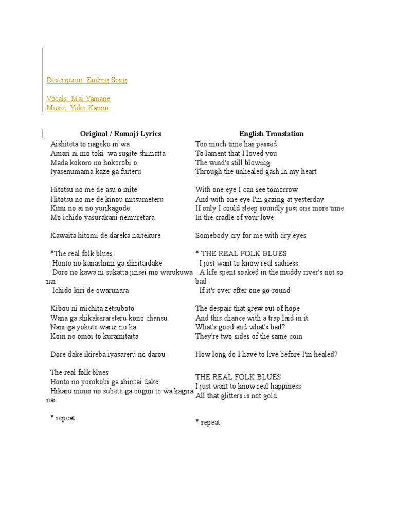 Honto no kanashimi ga shiritaidake. The real folk blues I need the pain My unhappiness is proof Im not insane Cause when Im close to you I swear I could die Need to live my life yeah live like Im alive And its a lonely road Good luck and goodbye. The Real Folk Blues is the first ending theme for Cowboy Bebop.